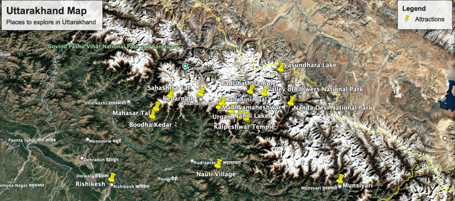 As you travel through Uttarakhand, you’ll be greeted by sweeping views of the Himalayas, dense forests, river valleys, and serene hill settlements. While the state is home to popular routes, it also offers countless lesser-known trails that remain peaceful and untouched. This map gives you a overview of Uttarakhand’s diverse landscape.